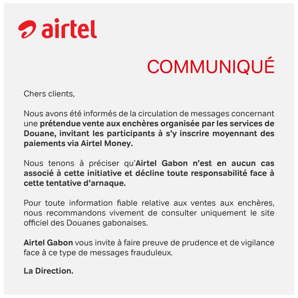 Airtel Gabon met en garde contre une arnaque liée à de fausses ventes aux enchères