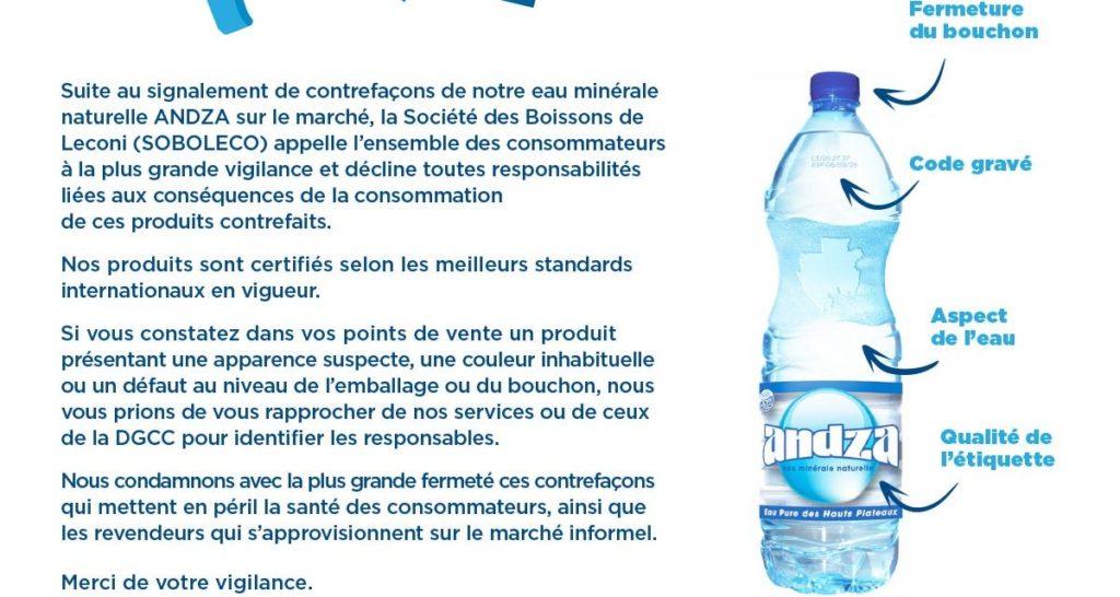 Dans un communiqué divulgué récemment, la Société des Boissons de Leconi (SOBOLECO) a exprimé sa préoccupation concernant la prolifération de contrefaçons de leur eau minérale naturelle ANDZA sur le marché. La société a appelé l’ensemble des consommateurs à la plus grande vigilance et a décliné toute responsabilité en ce qui concerne les conséquences potentielles de […]